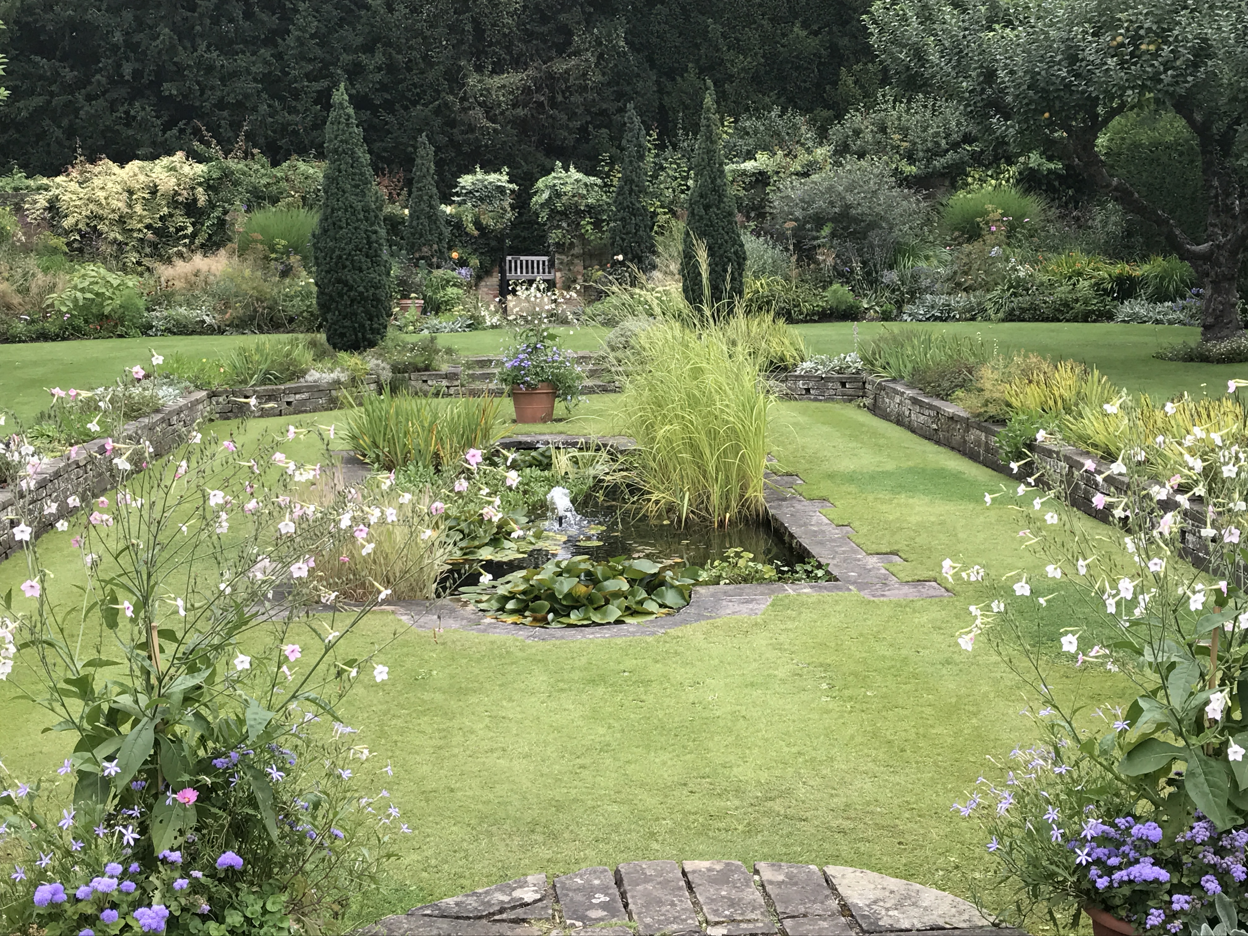 The Lantern House in Abington, England, is really a compound of handsome red brick cottages stitched together and interconnected by mysterious doors, and bordered by grand gardens of foliage, trees, blooming yellow dahlias and sweeping green velour lawns.