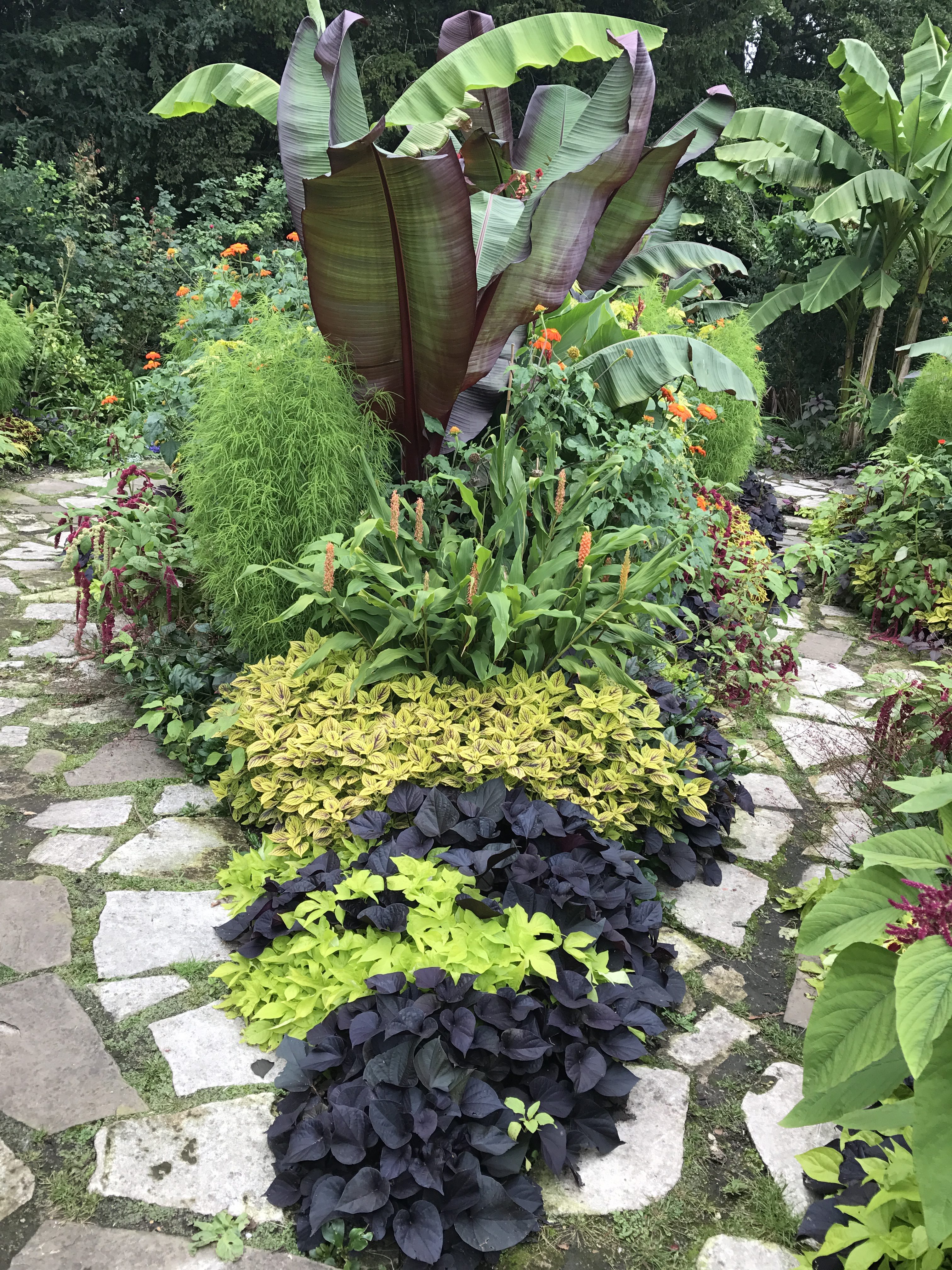 The owner, Sue, is tending the garden with loppers in her hand. She is fearless. A chipper whirs behind a high wall. Tree limbs await execution. Sue tells me that rabbits nibble on the plantings and moles poke up through the earth though to my eye the landscape is lush and manicured.